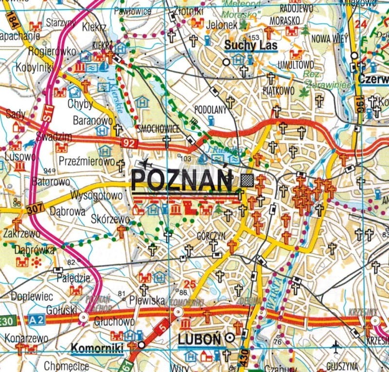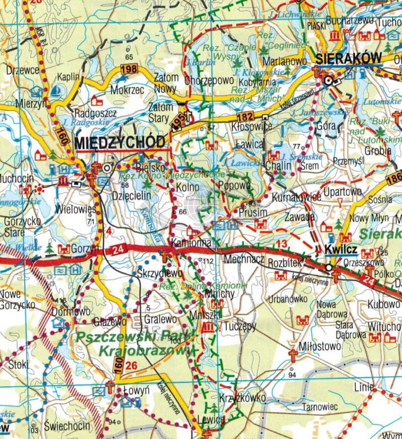 - przebieg turystycznych szlaków pieszych, rowerowych i kajakowych,
