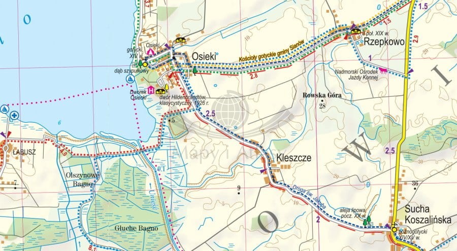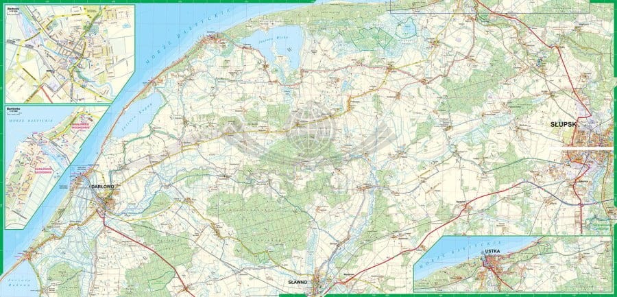 Mapa obejmuje m.in.: Mielno i Unieście, Łazy, Dąbki, Darłowo i Darłówko, Jarosławiec.