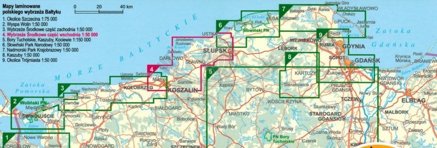 Składana, laminowana mapa turystyczna Wybrzeża Środkowego w skali 1:50 000 wydawnictwa ExpressMap.