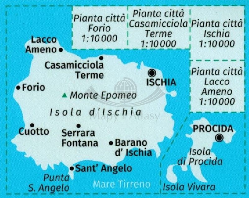 - miasta: Lacco Ameno, Forio, Casamicciola Terme, Ischia, Cuotto, Serrara Fontana, Sant' Angelo,Barano d'Ischia, Procida.