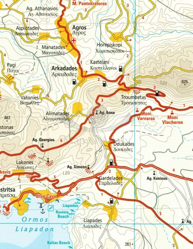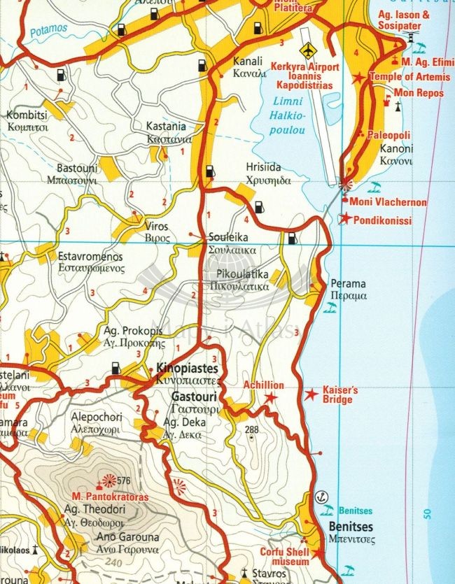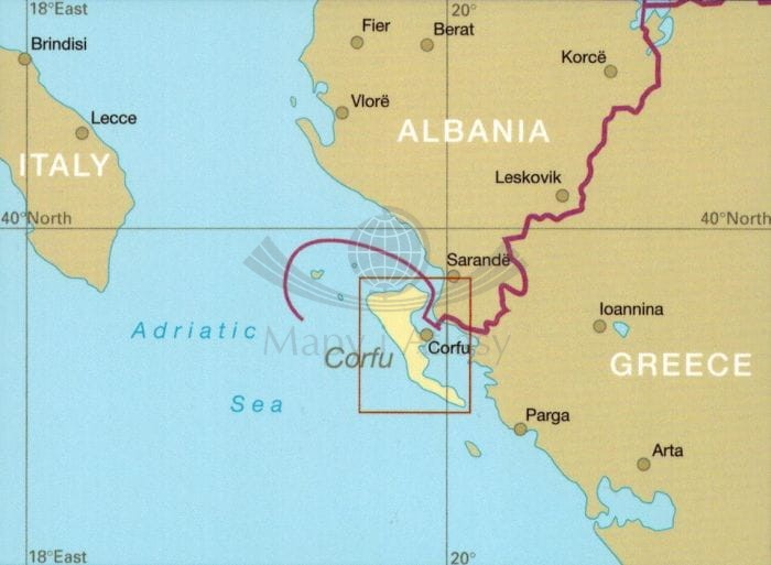 Składana, jednostronna, wodoodporna mapa samochodowo-turystyczna wyspy Korfu w skali 1:65 000 wydawnictwa Reise Know-How.