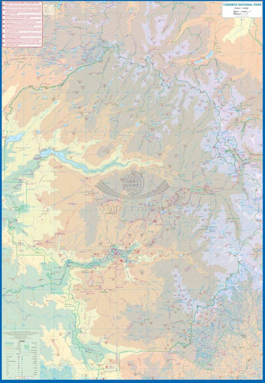 Składana, dwustronna, wodoodporna mapa samochodowo-turystyczna Parku Narodowego Yosemite w skali 1:90 000 oraz środkowej Kalifornii w skali 1:800 000 wydawnictwa ITMB.