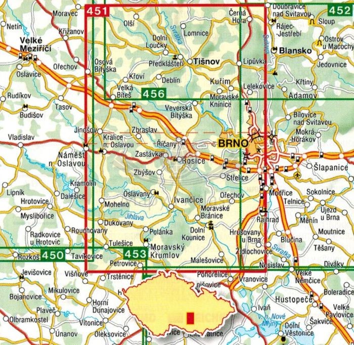 Zasięg mapy to: Olsi i Cerna Hora na północy, Lipuvka, Lelekovice, zachodnia część Brna i Hrusovany u Brna na wschodzie, Malesovice i Petrovice na południu oraz Tulesice, Dukovany, Mohelno, Jinosov i Osova Bityska na zachodzie.