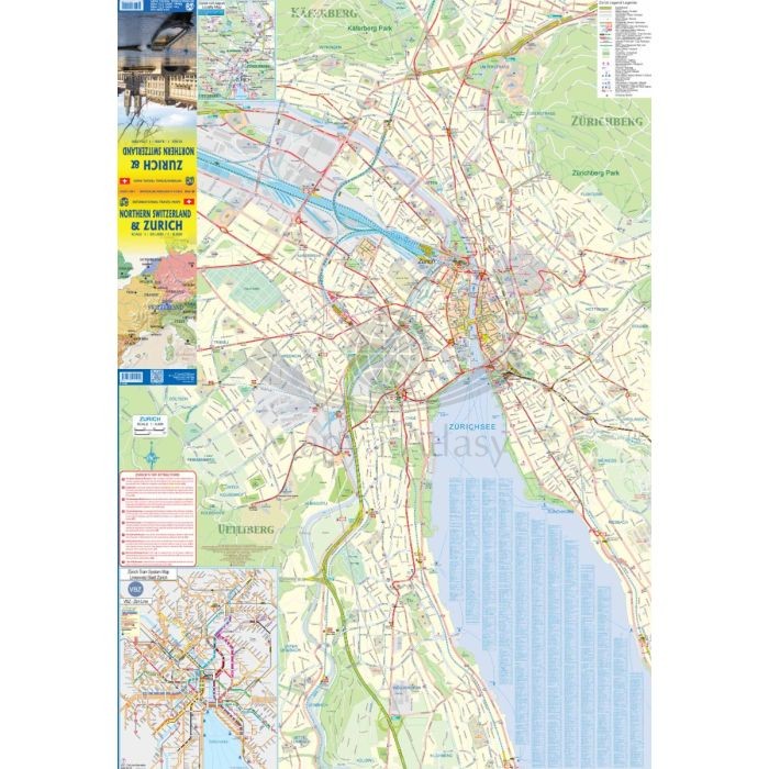 Składany plan miasta Zurychu w skali 1:8 000 oraz mapę samochodową północnej Szwajcarii w skali 1:301 000 wydawnictwa ITMB.