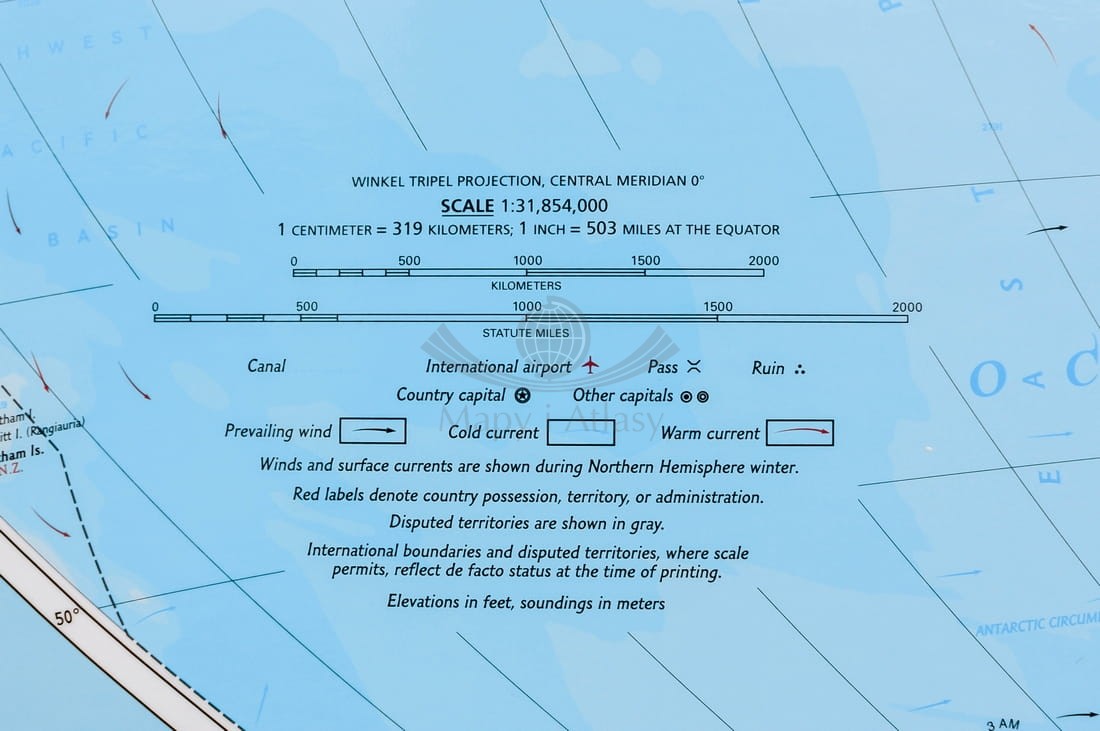 Mapa świata w skali 1:31 854 000, z morzami i oceanami w odcieniach błękitu w wersji do wpinania. Elementy mapy fizycznej, drogowej i administracyjnej. Stylizacja charakterystyczna dla wydawnictwa National Geographic.
