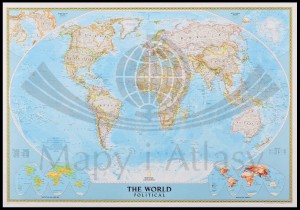 Mapa świata w skali 1:31 854 000, z morzami i oceanami w odcieniach błękitu w ramie drewnianej. Elementy mapy fizycznej, drogowej i administracyjnej. Stylizacja charakterystyczna dla wydawnictwa National Geographic.