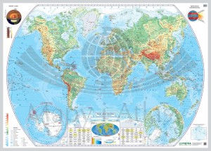Fizyczna mapa świata w skali 1:28 000 000 w wersji do wpinania. Na mapie zaznaczono m.in.: granice państw, stolice państw i terytoriów zależnych, pustynie: piaszczyste, żwirowe, kamieniste, lodowce i lądolody, szczyty, wulkany, wodospady, katarakty...