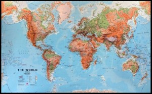 Mapa fizyczna świata w skali 1:30 000 000 wydawnictwa Maps International w ramie drewnianej. Kolorami zaznaczono wzniesienie terenu ponad poziom morza, odcieniami koloru niebieskiego głębokość mórz i oceanów. Granice zaznaczone liniami.