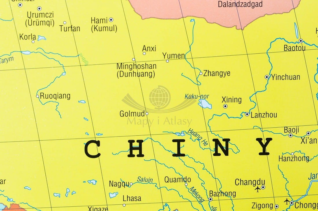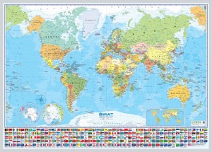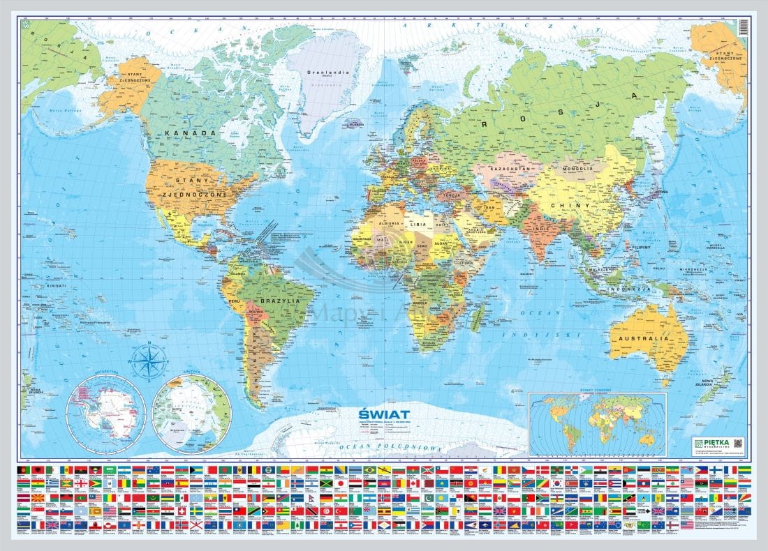 Mapa polityczna świata w skali 1:28 000 000 w wersji do wpinania wyróżnia aktualne granice państw świata, a także w czytelny sposób prezentuje ich stolice oraz stolice państw niezależnych. W dolnej części znajdują się mapy biegunów, flagi narodowe oraz mapa przedstawiająca podział stref czasowych na świecie.