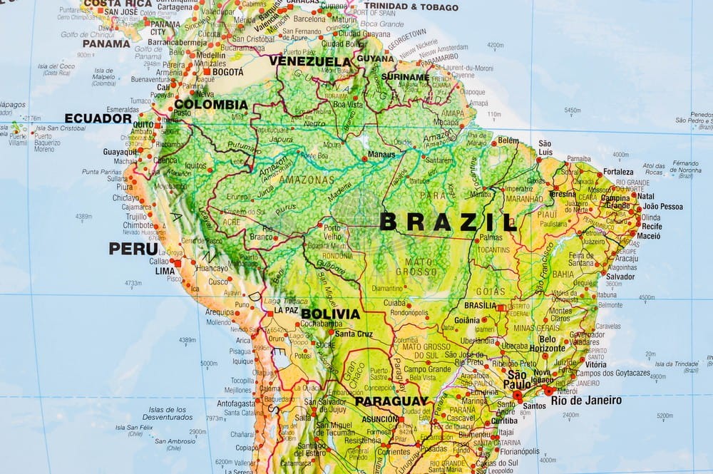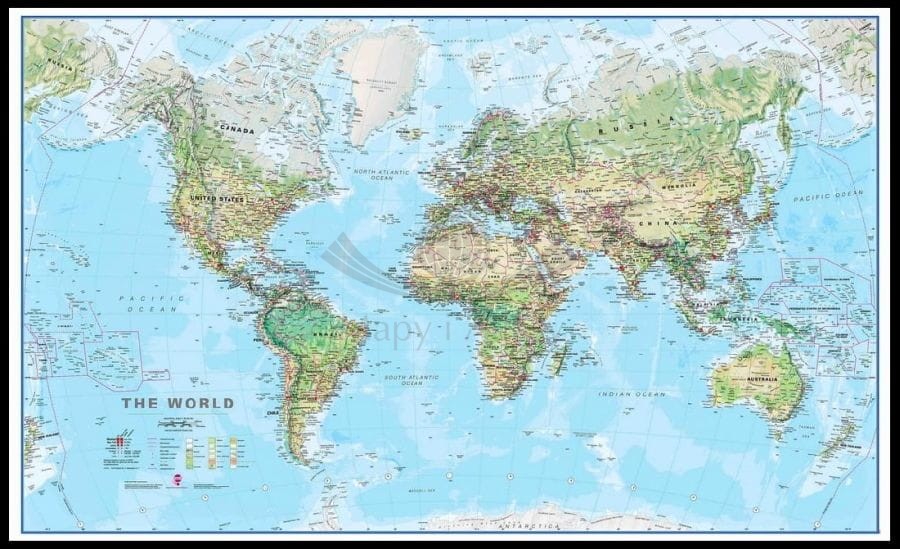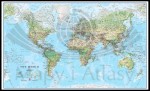 Mapa fizyczna (środowiskowa) świata w skali 1:30 000 000 w ramie drewnianej wydawnictwa Maps International.