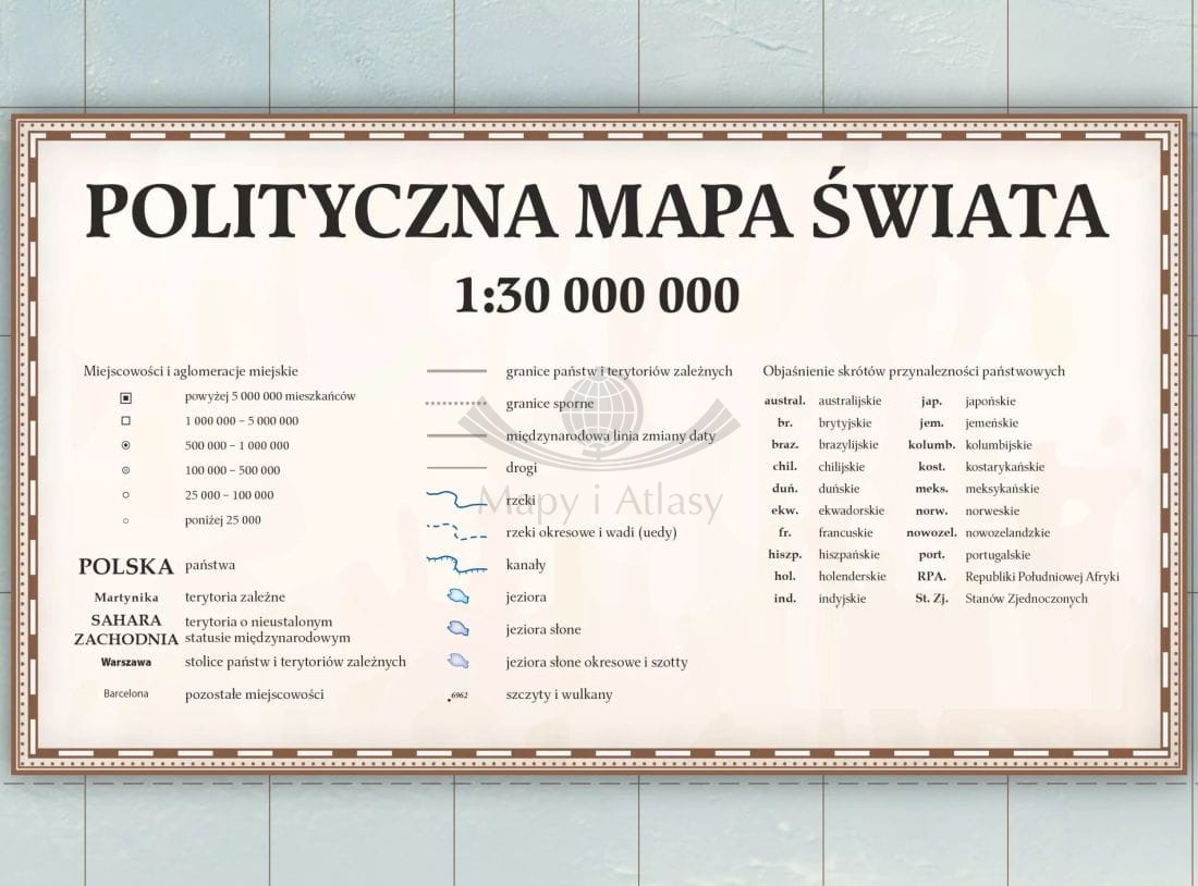 Stylizowana mapa polityczna świata w skali 1:30 000 000 w ramie drewnianej wydawnictwa ArtGlob.