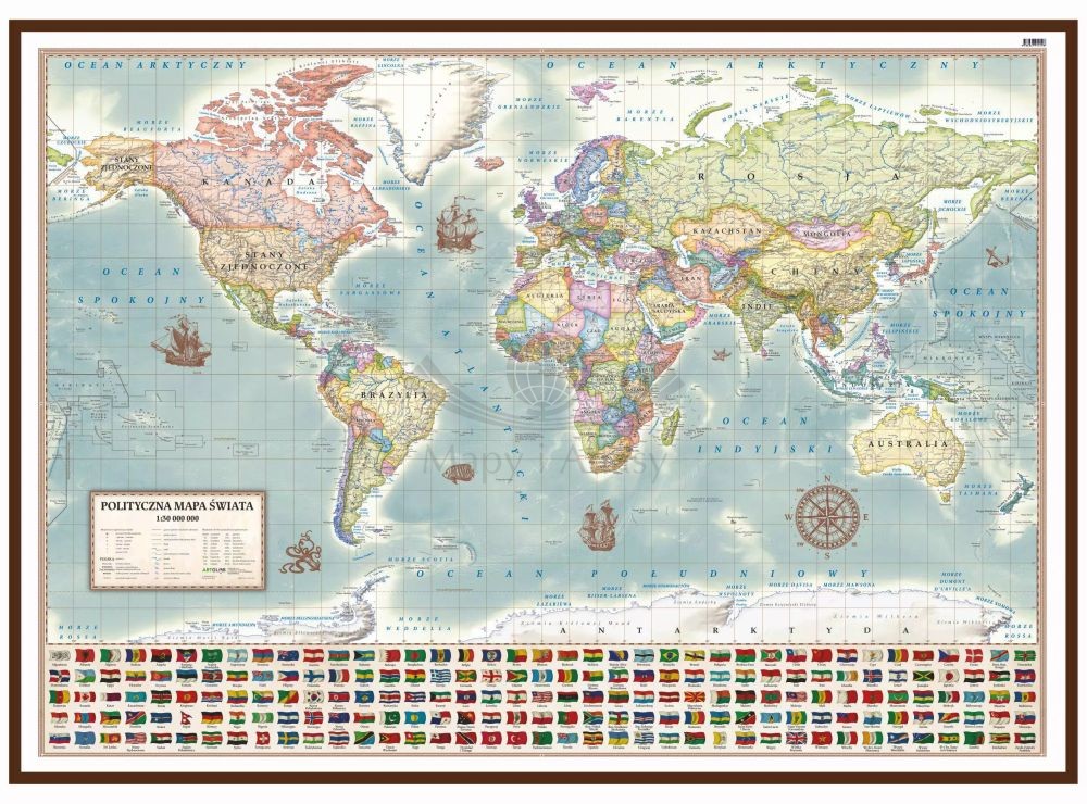 Dodatkowo w dolnej części mapy umieszczono flagi wszystkich państw świata, dzięki czemu stanowi ona bogate źródło wiedzy.