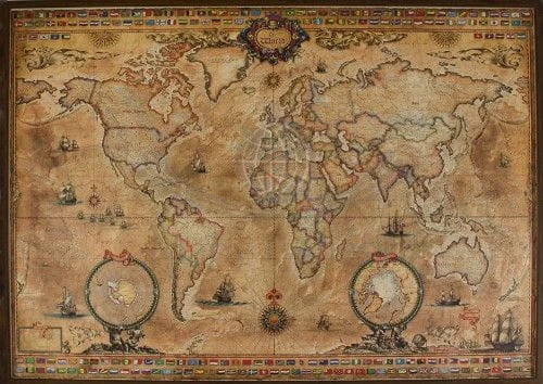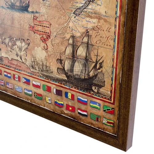 Mapa stylizowana "antyczna" Świata z flagami a'la pergamin w skali 1:33 000 000 w wersji do wpinania, wydawnictwa Ray&Co. Cechy mapy: aktualny podział polityczny świata, flagi państwowe, eleganckie detale, stylowa kolorystyka...