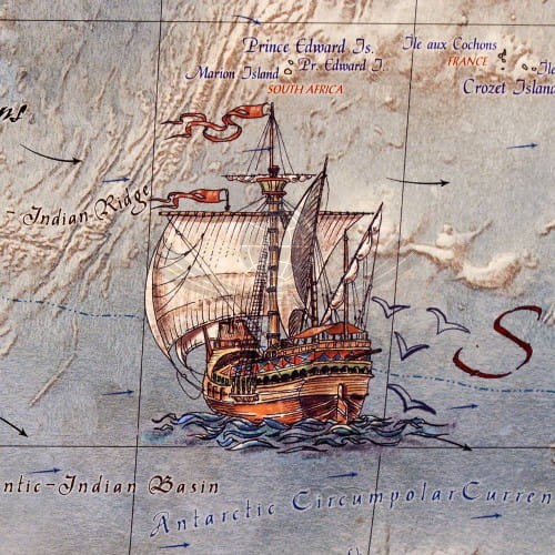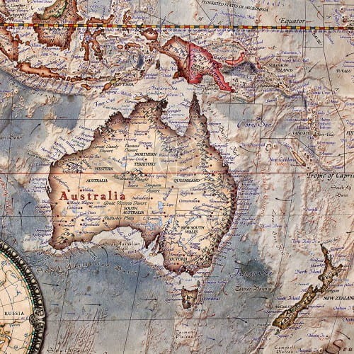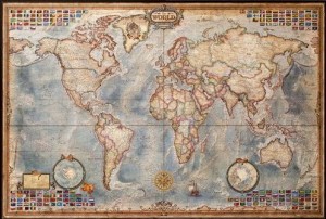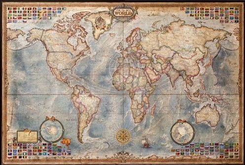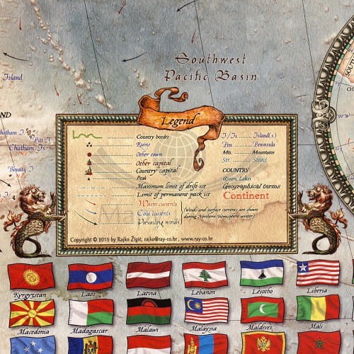 Mapa stylizowana "antyczna" Świata z flagami w skali 1:33 000 000 w wersji magnetycznej, wydawnictwa Ray&Co. Cechy mapy: aktualny podział polityczny świata, flagi państwowe, eleganckie detale, stylowa kolorystyka...