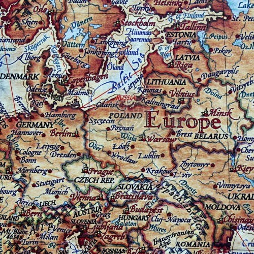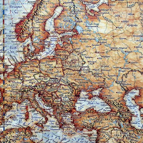 Mapa gotowa do zawieszenia na ścianie jako tablica. Na czas transportu mapa jest zabezpieczana narożnikami z pianki i opakowaniem kartonowym.