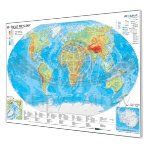 Mapa przedstawiająca ukształtowanie powierzchni świata w skali 1:22 000 000 w ramie wydawnictwa Meridian. Klasyczna, poziomicowa mapa fizyczna została wzbogacona dodatkowo o informacje na temat ochrony środowiska.