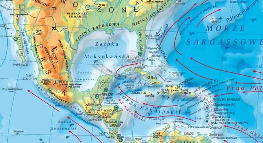 Klasyczna, poziomicowa mapa fizyczna została wzbogacona dodatkowo o informacje na temat ochrony środowiska. Umieszczone są na niej rezerwaty biosfery wpisane na światową listę dziedzictwa UNESCO, a ich lista wypisana jest pod mapą. W treści mapy znajdują się również prądy morskie, z podziałem na ciepłe i zimne, formy dna oceanicznego, punkty wysokościowe (góry, wulkany), głębokości, depresje, granice kontynentów, oceanów oraz podział na strefy czasowe.