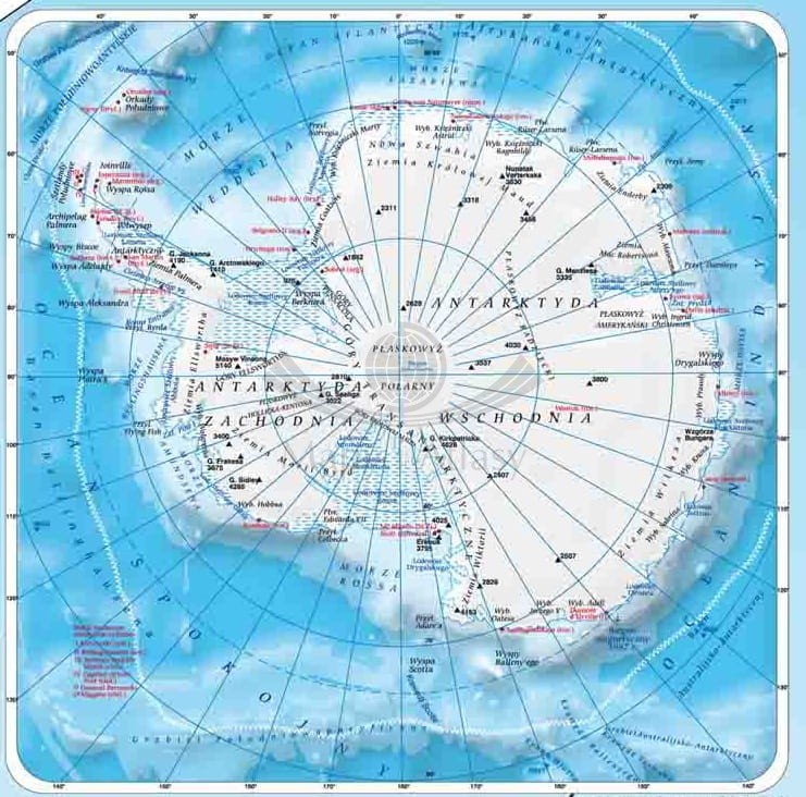 Mapa przedstawiająca ukształtowanie powierzchni świata w skali 1:22 000 000 w ramie wydawnictwa Meridian.