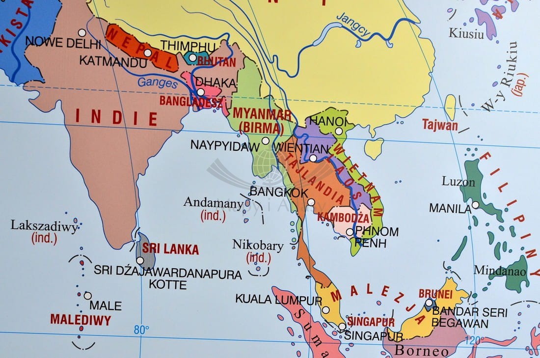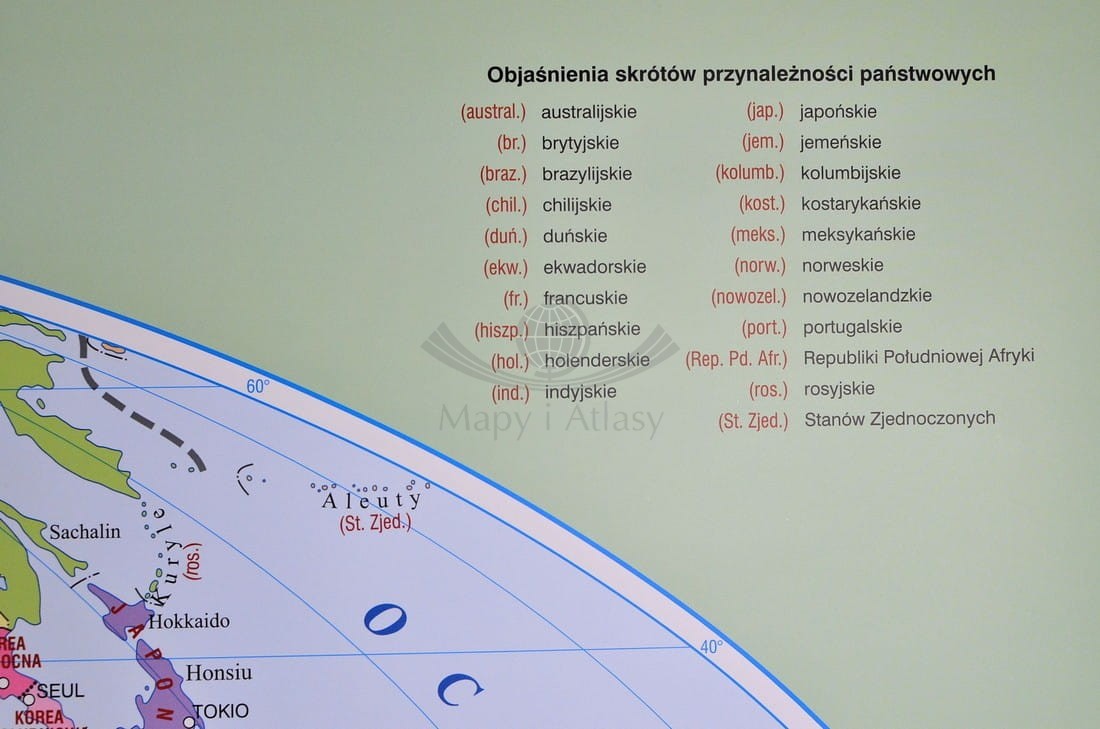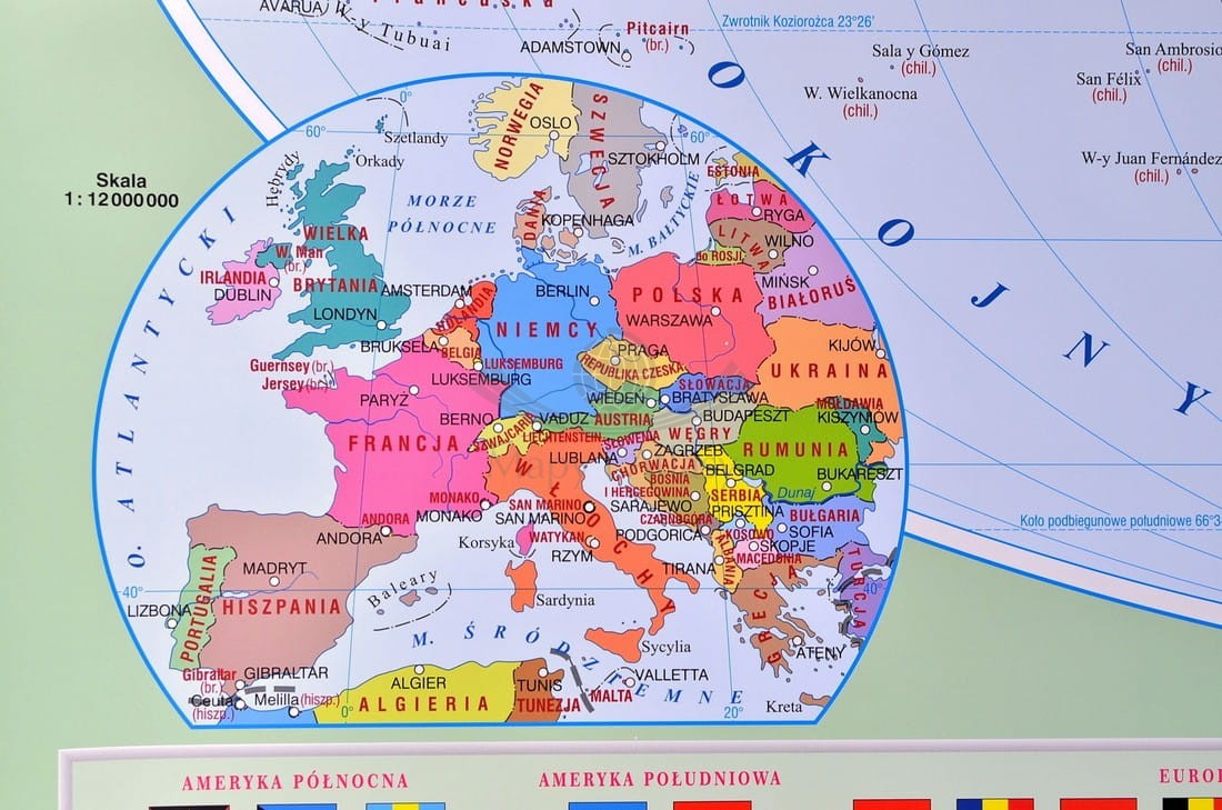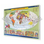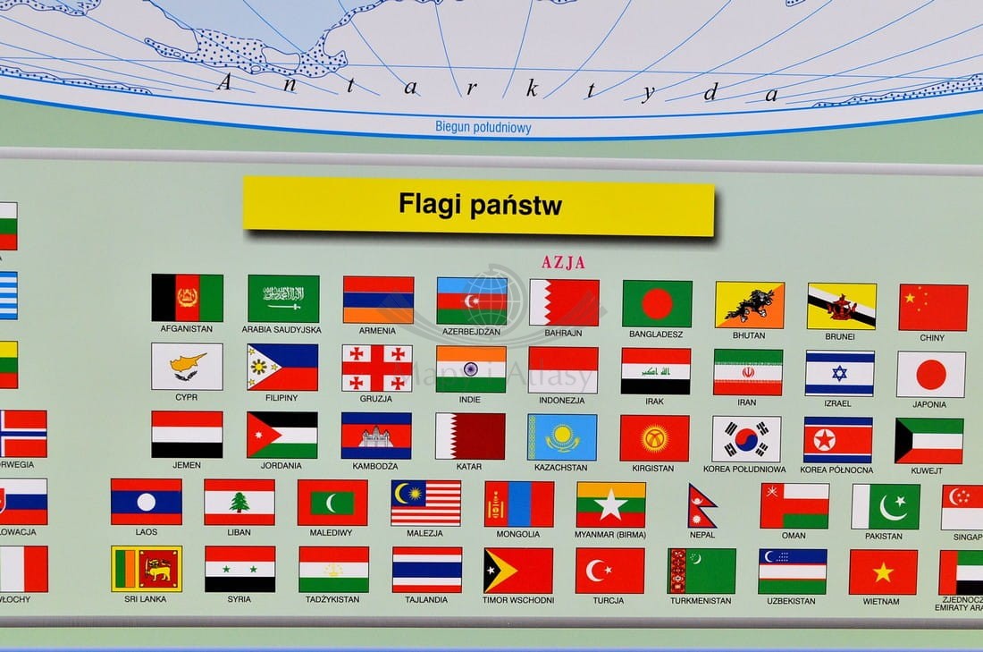 Mapa podziału politycznego świata w skali 1:24 000 000 w ramie wydawnictwa Nowa Era. Zawiera także flagi państw uporządkowane według kontynentów.