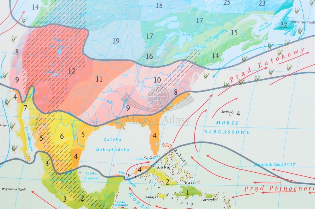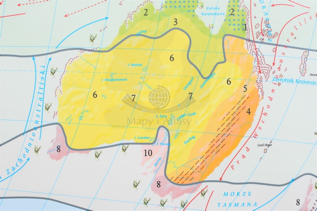 Dodatkowo uwzględnione zostały astrefowe odmiany klimatów: górskie i monsunowe, a także istotne regulatory klimatu światowego czyli prądy morskie, z podziałem na ciepłe i zimne, stałe i okresowe. Na mapie zaznaczone są także zasięgi występowania raf koralowych oraz lasów brunatnic.