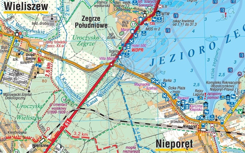 Mapa - "Jezioro Zegrzyńskie i okolice" - przedstawia fragment terenu bezpośrednio przyległego do tego jeziora. Z administracyjnego punktu widzenia jest to Powiat Legionowski wraz z najbliższym otoczeniem. W części przewodnikowej mapy zamieszczono opisy dwunastu tras rowerowych, siedmiu szlaków pieszych oraz schemat szlaków turystycznych przydatny podczas planowania własnych wycieczek pieszych i rowerowych. Znajduje się tu także informator krajoznawczy z opisem najważniejszych miejscowości oraz 5 planów centrów miejscowości (w skalach 1:8 700 - 1:10 000): Legionowa, Nieporętu, Serocka, Zegrza i Zegrza Południowego.