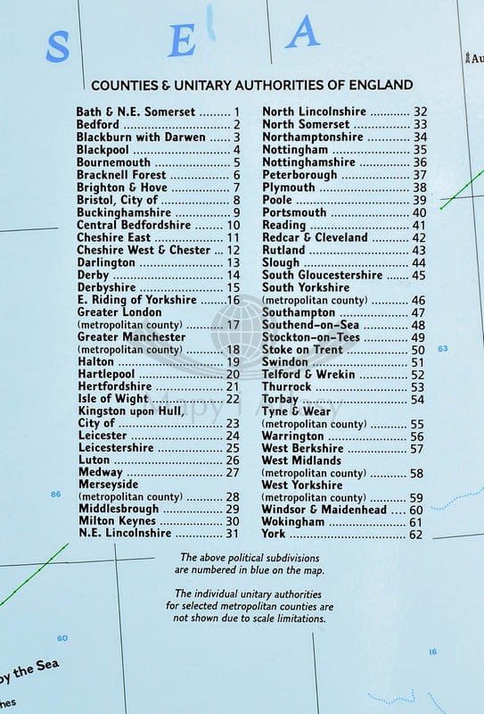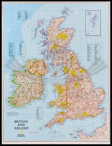 Mapa Wielkiej Brytanii i Irlandii w skali 1:1 687 000 w ramie drewnianej. Stylizacja charakterystyczna dla National Geographic. Mapa oprawiona w rurki plastikowe, błyszczący laminat.
