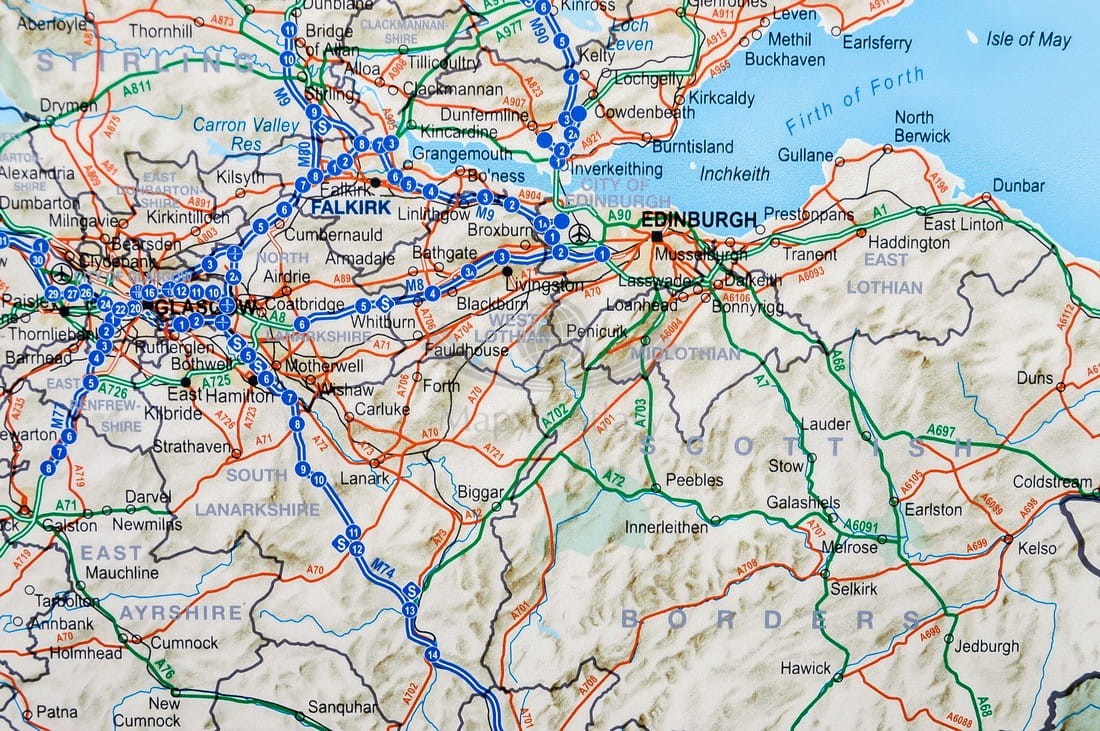 Drogowa mapa Wielkiej Brytanii w skali 1:850 000 wydawnictwa Maps International w ramie aluminiowej. Na mapie zaznaczono m.in.: autostrady, drogi, numery dróg, miasta, koleje, porty lotnicze, tabelę odległości (w kilometrach i milach),