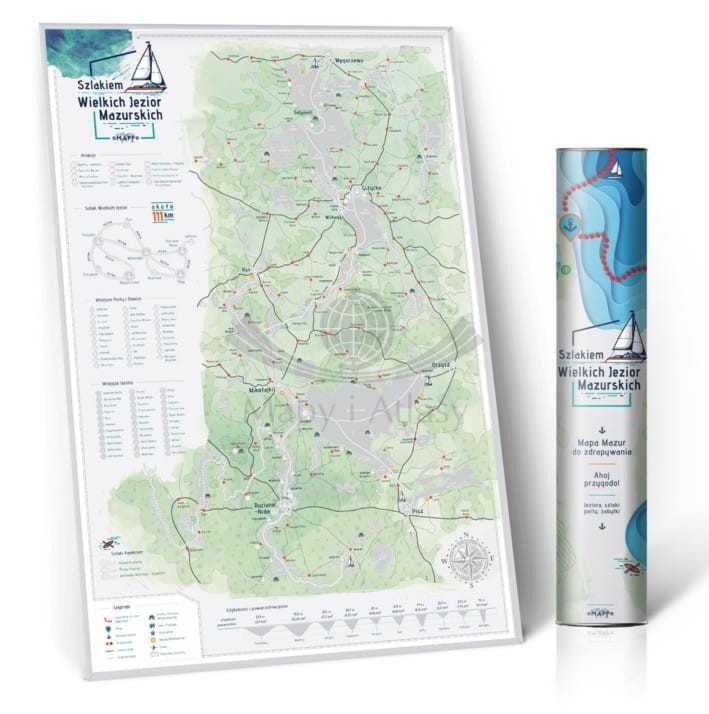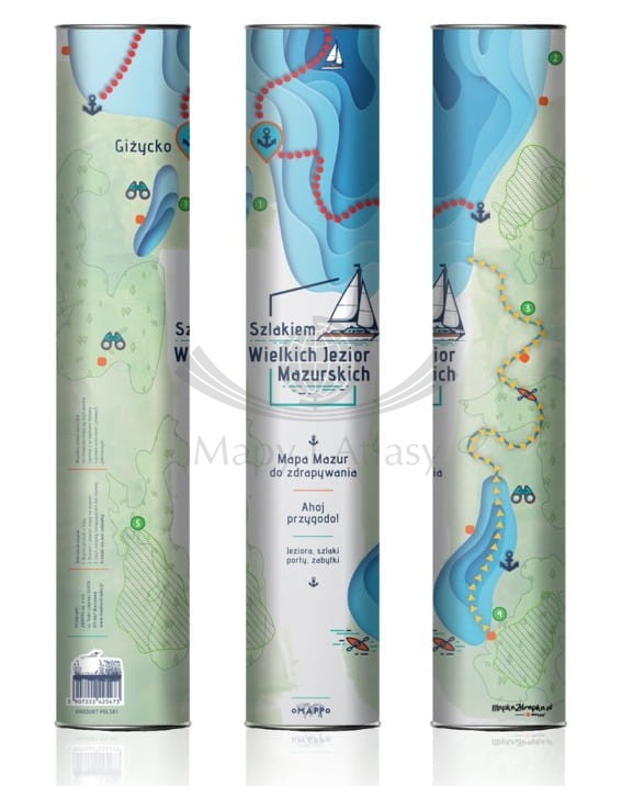 Mapa zdrapka "Szlakiem Wielkich Jezior Mazurskich" to zapis Twoich wakacyjnych wojaży po najpiękniejszych zakątkach Krainy Wielkich Jezior Mazurskich- od Węgorzewa aż za Ruciane-Nida. Jeziora, rzeki, lasy, porty i stanice oraz inne atrakcje – wszystkie je znajdziesz na mapie do zdrapywania. Dzięki mapie możesz zachować piękne wspomnienia, ciesząc się zdrapywaniem odkrytych już zakątków Mazur. Szlaki żeglarskie i kajakowe ukryte pod srebrną warstwą do zdrapywania zmotywują Cię do poznania całego Szlaku Wielkich Jezior Mazurskich.