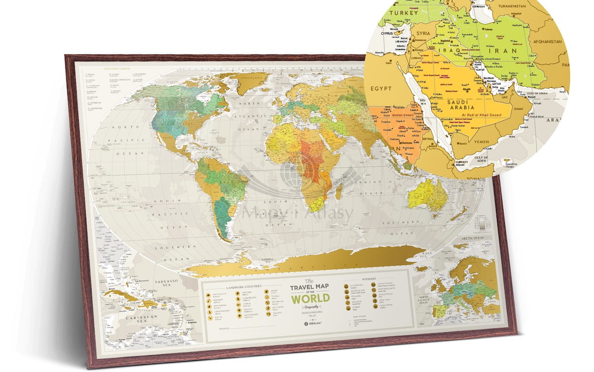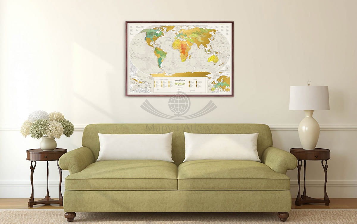 Travel Map™ Geography World pięknie prezentuje się zarówno w tradycyjnych, jak i nowoczesnych wnętrzach. Jej stylowy wygląd wspaniale nadaje się do oprawienia w drewniane lub złocone ramy. Jest wspaniałym pomysłem na prezent dla przebojowych i otwartych osób które kochają piękne przedmioty i podróże.