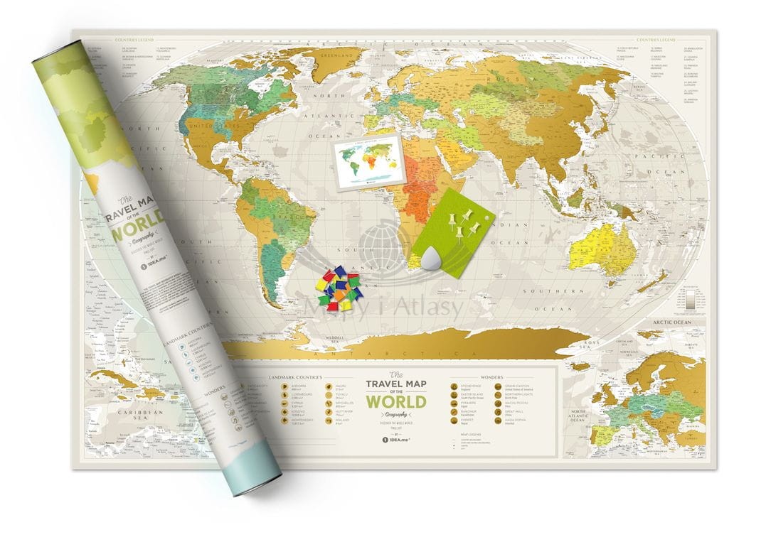 Travel Map™ Geography World zawiera mnóstwo małych wysepek oraz krajów i miast. Unikatowy wygląd nadaje jej złota warstwa do zdrapywania nałożona na klasyczny i elegancki projekt mapy. Możesz z łatwością zaznaczyć państwa, które odwiedziłeś. Po prostu użyj dołączonej do mapy kostki do zdrapywania i usuń złota zdrapkę, aby odkryć miejsca w których już byłeś, tworząc spektakularny zapis historii swoich podróży. Travel Map™ Geography World jest limitowanym produktem i kierowana jest do osób z prawdziwym wyczuciem stylu i smaku.