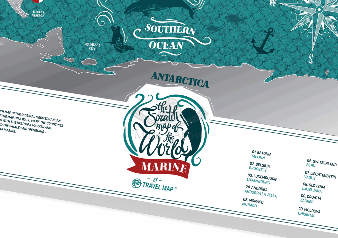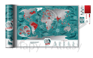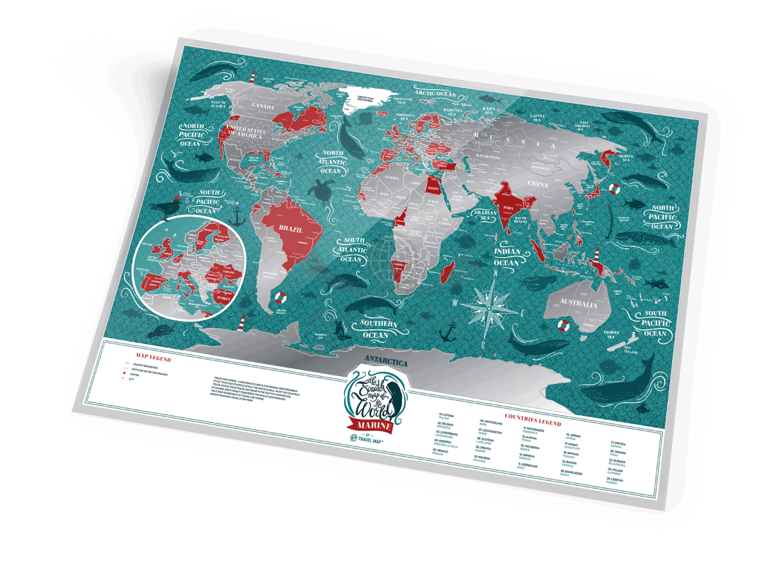 Travel Map™ Marine World to mapa świata pokryta srebrną powłoką do zdrapywania. Unikalny projekt graficzny świetnie sprawdzi się zarówno w romantycznym jak i nowoczesnym wnętrzu. Możesz z łatwością zdrapać państwa, które odwiedziłeś ciesząc się wspaniałymi grafikami zwierząt. Po prostu użyj dołączonej kostki, aby usunąć srebrną warstwę i odkryj miejsca w których już byłeś tworząc spektakularny zapis historii swoich podróży.