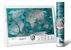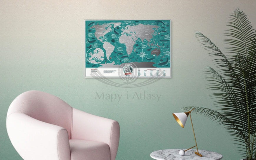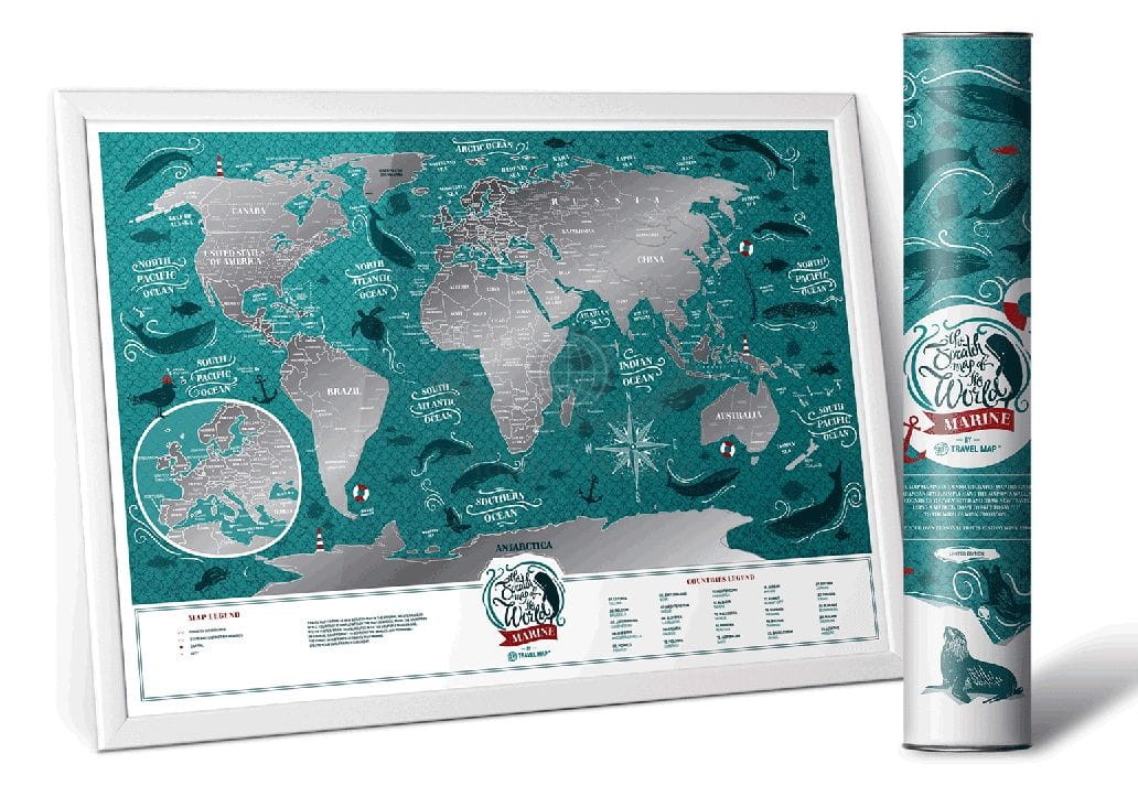 Travel Map™ Marine World w ramie to mapa świata pokryta srebrną powłoką do zdrapywania. Unikalny projekt graficzny świetnie sprawdzi się zarówno w romantycznym jak i nowoczesnym wnętrzu. Możesz z łatwością zdrapać państwa, które odwiedziłeś ciesząc się wspaniałymi grafikami zwierząt. Po prostu użyj dołączonej kostki, aby usunąć srebrną warstwę i odkryj miejsca w których już byłeś tworząc spektakularny zapis historii swoich podróży.