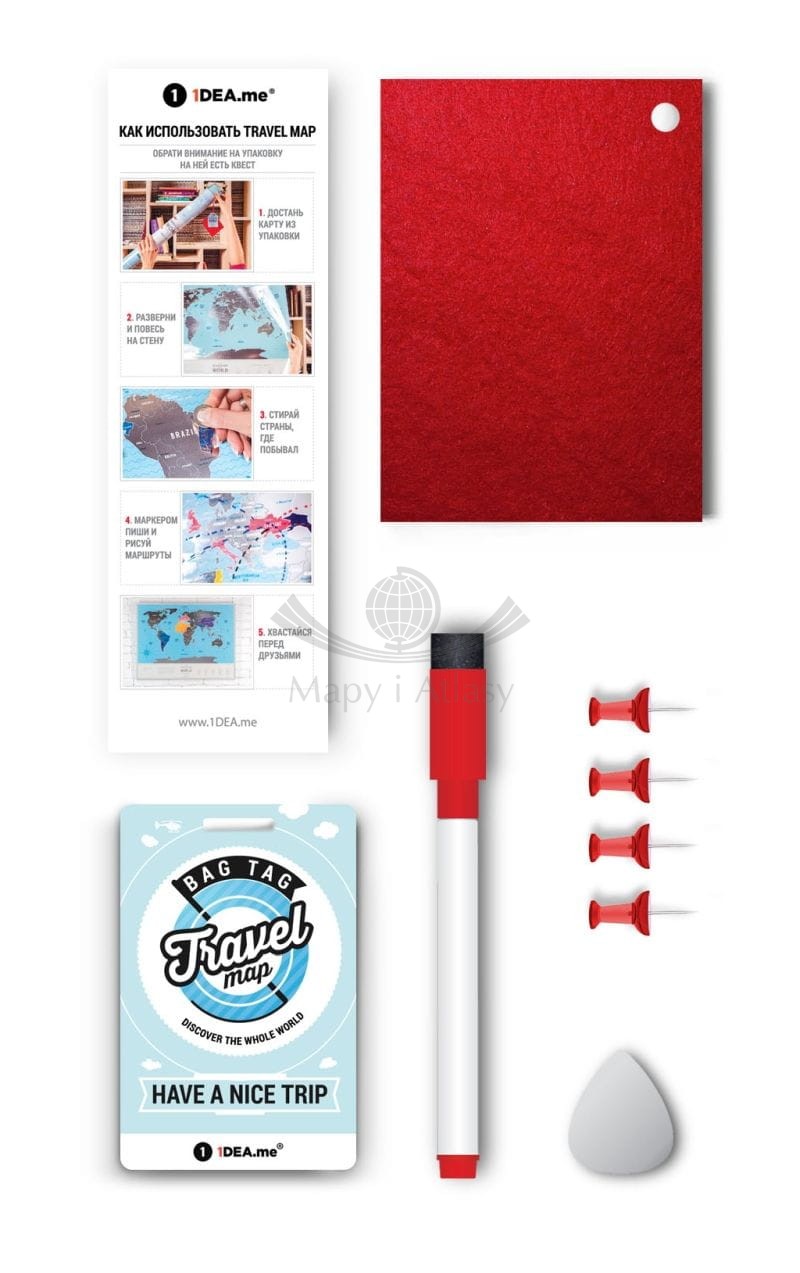 Dodatkowo możesz specjalnym pisakiem rysować plany swoich kolejnych podróży i zaznaczać na mapie kolejne miejsca na świecie, które chcesz odwiedzić. Wszystkie zapiski można łatwo usunąć dołączoną do zastawu szmatką.