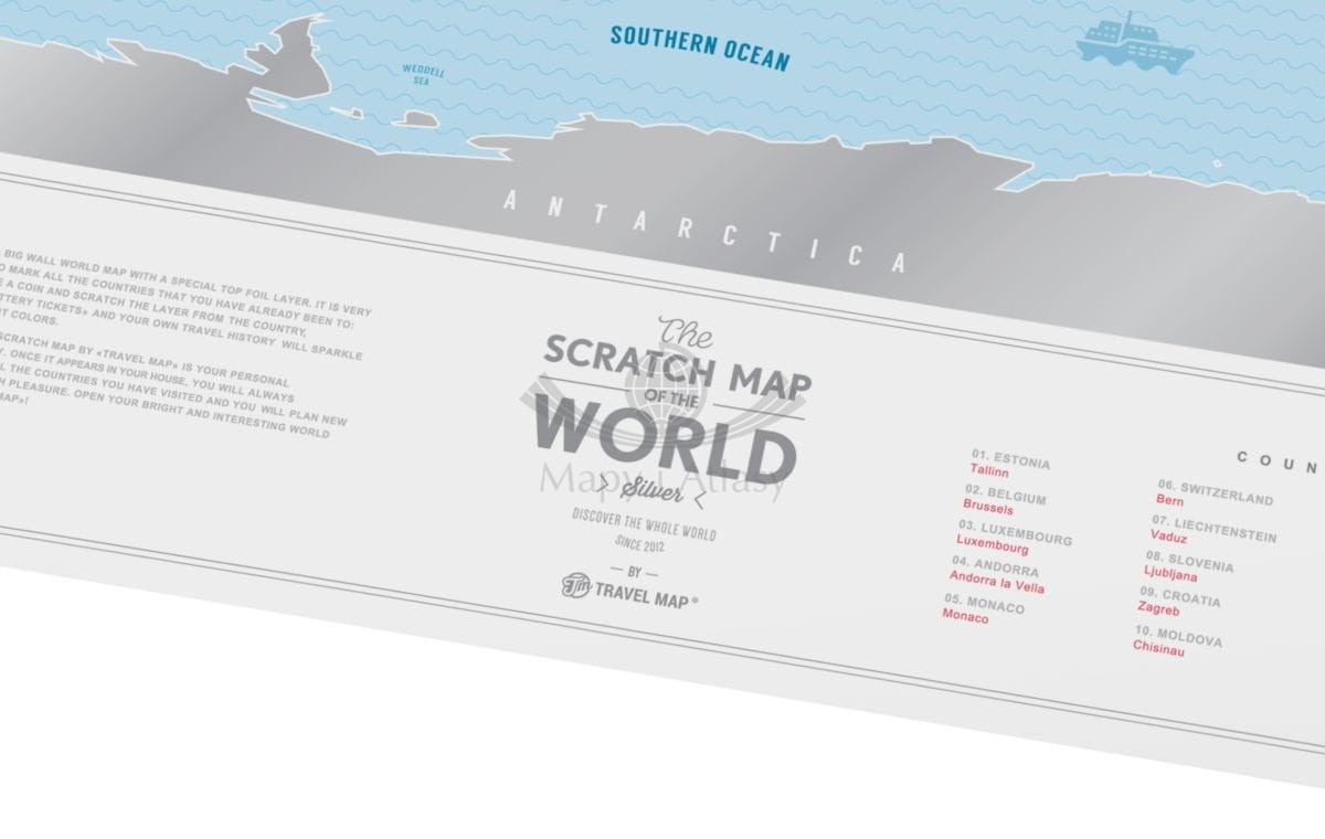 Mapa zdrapka świata "Silver World" w tubie. Travel Map™ Silver World jest mapą świata ze specjalną powłoką do zdrapywania. Możesz z łatwością zaznaczyć państwa, które odwiedziłeś: po prostu użyj dołączonej kostki aby usunąć srebrną zdrapkę i odkryj miejsca w których już byłeś tworząc widoczny zapis historii swoich podróży.