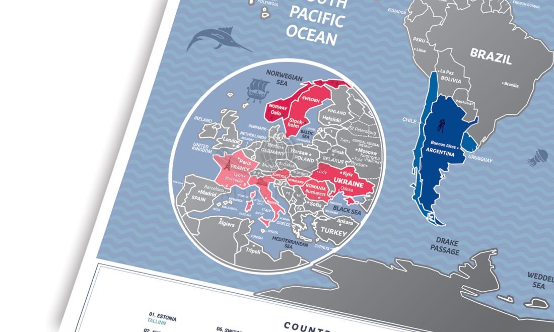 Kompaktowa, osobista mapa zdrapka świata w ramie stworzona jako wyjątkowa pamiątka Twoich mniejszych i większych podróży. Travel Map™ Weekend World to asystent, przyjaciel i oddany kompan każdego miłośnika podróży. Mapa została pokryta specjalną srebrną powłoką do zdrapywania