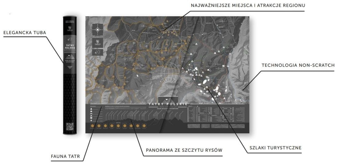 Mapa ta, to zestawienie miejsc, które zapisały się w historii polskiego taternictwa pasjonującymi wydarzeniami. Na mapie znajdują się najciekawsze szlaki i miejsca w polskich Tatrach. Dzięki oznaczeniom na mapie można odnaleźć ponad 80 tatrzańskich atrakcji. Zdrapka pomaga odkryć wspinaczkową stronę Tatr. Dodatkowe oznaczenia odsłaniają Tatry widziane oczyma alpinistów - miejsca niedostępne dla zwykłych turystów.