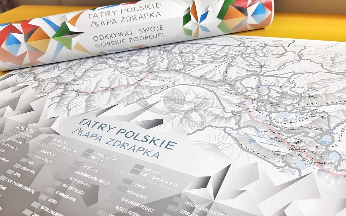 Mapa w skali 1:93 000 umieszczona jest na arkuszu i znajdują się na niej wszystkie szlaki w Polskich Tatrach o łącznej długości 275 km. Do zdrapania również aż 90 kluczowych miejsc Polskich Tatr.