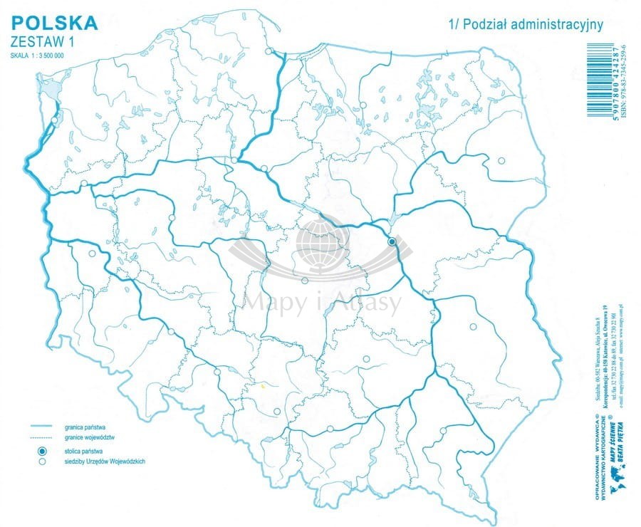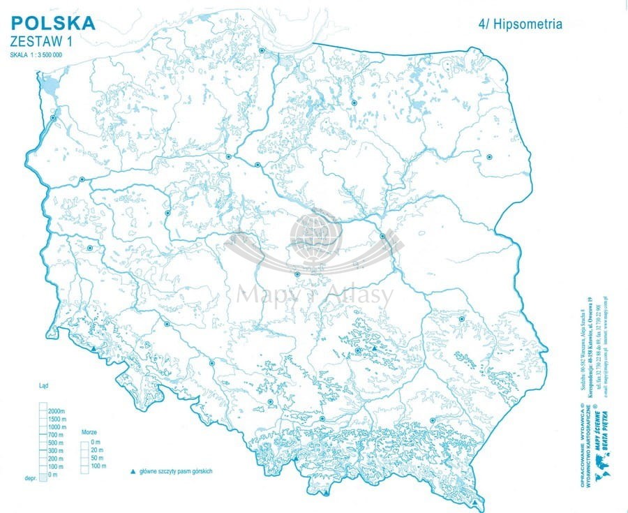 Bloczek z mapami konturowymi Polski do ćwiczeń. Mapy w zestawie: Podział administracyjny ogólny, Podział administracyjny szczegółowy, Hipsometria przedstawiona nasyceniem odcienia, Hipsometria przedstawiona poziomicami, Krainy geograficzne...