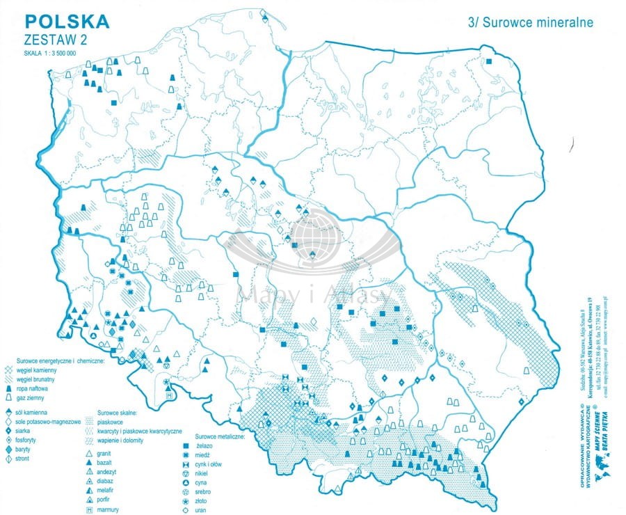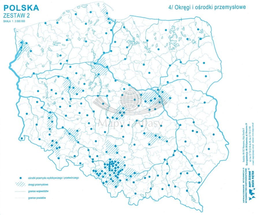 Bloczek z mapami konturowymi Polski do ćwiczeń. Mapy w zestawie: Podział administracyjny, Gęstość zaludnienia i miasta powyżej 50 tys. mieszkańców, Surowce mineralne...