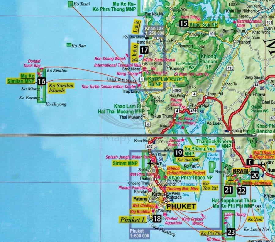 - wygodne mapy: południowej części Tajlandii w skali 1:160 000, Ko Samui 1:250 000, Khao Lak 1:250 000, Phuket 1:600 000; plany miast: Bangkoku 1:21 000 i Krabi 1:24 500