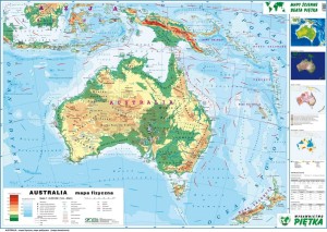 Mapa ścienna Australii w formie naklejki w skali 1:6 200 000. Mapa przedstawia ukształtowanie powierzchni (mapa fizyczna) oraz cztery dodatkowe mapy: zdjęcia satelitarne, geologia, wody artezyjskie (wszystkie w skali 1:53 000 000).