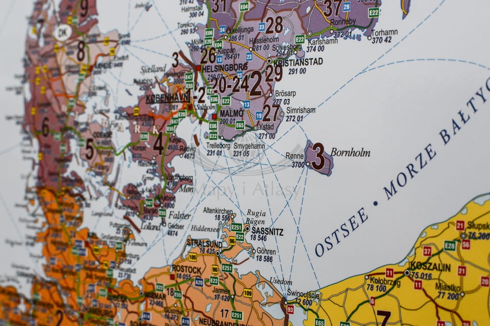 Mapa ścienna kodowa Europy z zaznaczonymi drogami w skali 1:3 600 000 w formie naklejki na ścianę.