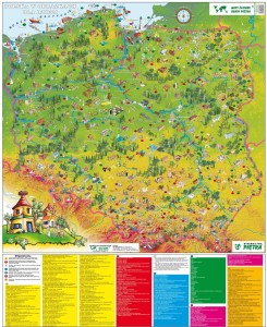 Ścienna mapa obrazkowa Polski dla dzieci w formie naklejki. Zawiera ciekawe budowle, skarby kultury, osobliwości regionów, obiekty i postaci nawiązujące do mitów i legend, obiekty sportowe, parki rozrywki, uzdrowiska, zoo, wesołe miasteczka, skocznie narciarskie, zwierzęta i rośliny występujące na danym terenie, obiekty przemysłowe, ciekawostki takie jak znaleziska archeologiczne, jaskinie, bunkry, planetaria, wodospady.