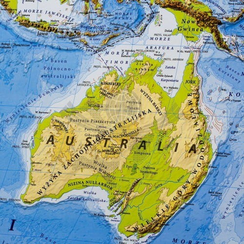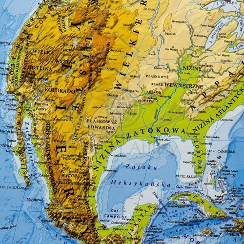 Świat fizyczny w skali 1:25 000 000 - mapa ścienna w formie naklejki wielokrotnego użytku, została opracowana przez wydawnictwo Eko-Graf. Przyjazna kolorystyka i czytelna grafika sprawia, że idealnie nadaje się do biura czy jako ozdoba wnętrza.