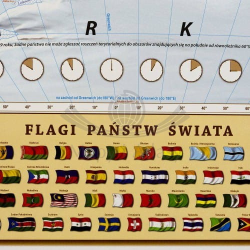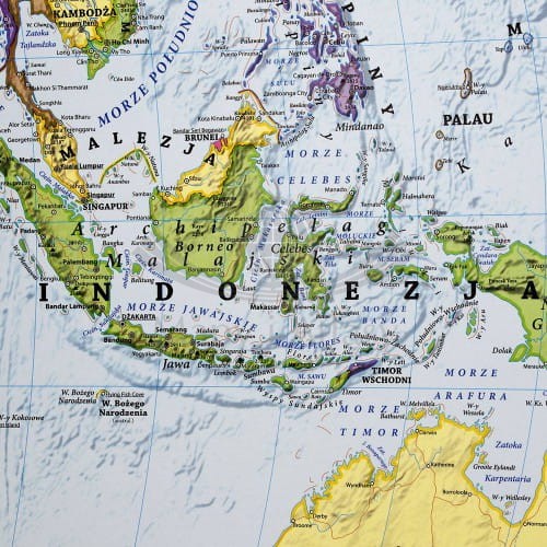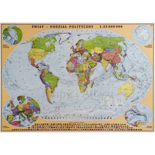 Świat polityczny w skali 1:25 000 000 - mapa ścienna w formie naklejki wielokrotnego użytku, została opracowana przez wydawnictwo Eko-Graf. Przyjazna kolorystyka i czytelna grafika sprawia, że idealnie nadaje się do biura czy jako ozdoba wnętrza. Ukazuje podział polityczny świata w skali 1:25 000 000, oba bieguny w skali 1:42 500 000 oraz Karaiby i Europę w skali 1:13 300 000. Dodatkowo w dolnej części mapy umieszczone są flagi wszystkich państw.