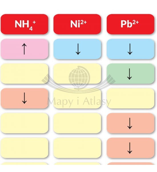Tabela rozpuszczalności w rozmiarze 250 x 181 cm - to plansza dydaktyczna w formie bezklejowej naklejki wielokrotnego użytku obrazująca rozpuszczalność związków, które komponuje się z umieszczonych na jednej z osi kationów, na drugiej anionów. Zawiera bardzo czytelne informacje o charakterze rozpuszczalności w wodzie, tj.: związek jest dobrze rozpuszczalny w wodzie, wytrąca się osad, wytrąca się osad z roztworów stężonych, zachodzą sko10plikowane reakcje chemiczne.