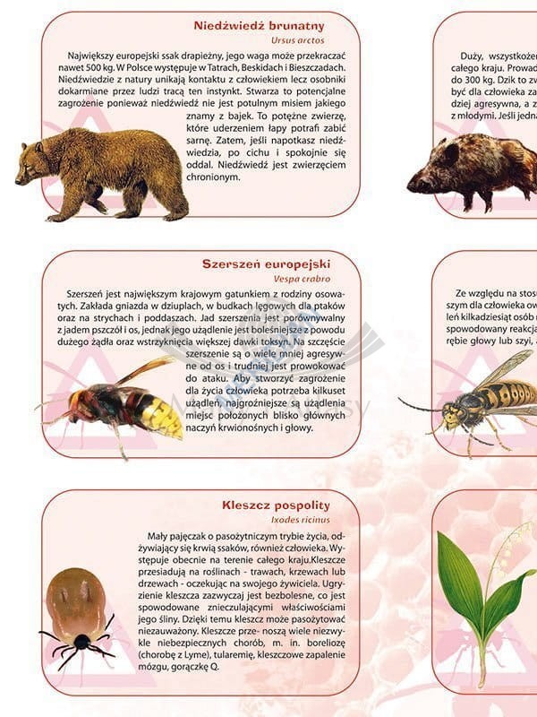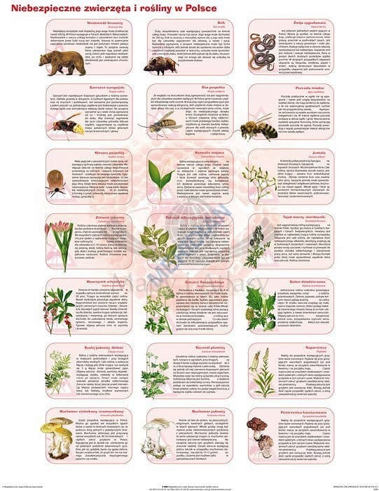 Ścienna plansza edukacyjna do biologii przedstawiająca 21 gatunków niebezpiecznych zwierząt i roślin występujących w Polsce. Każdy z gatunków pokazany jest na ilustracji oraz opatrzony opisem...