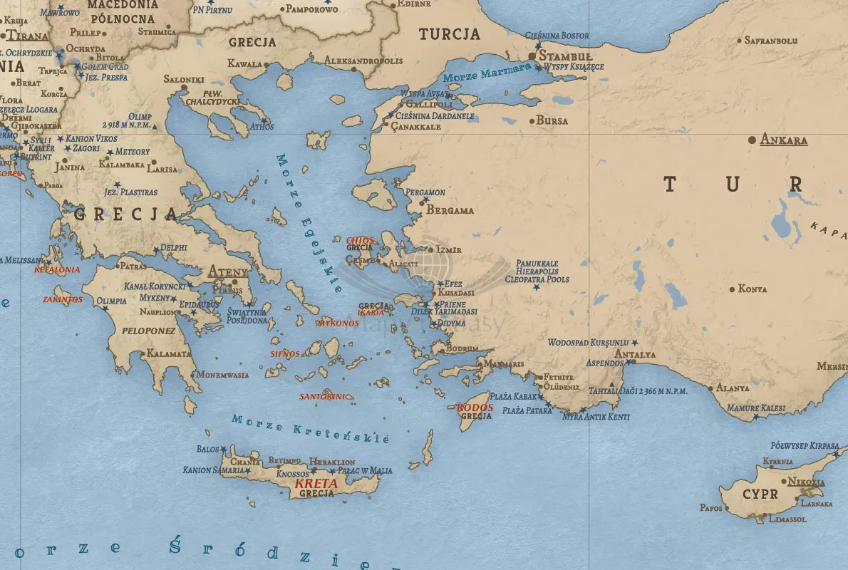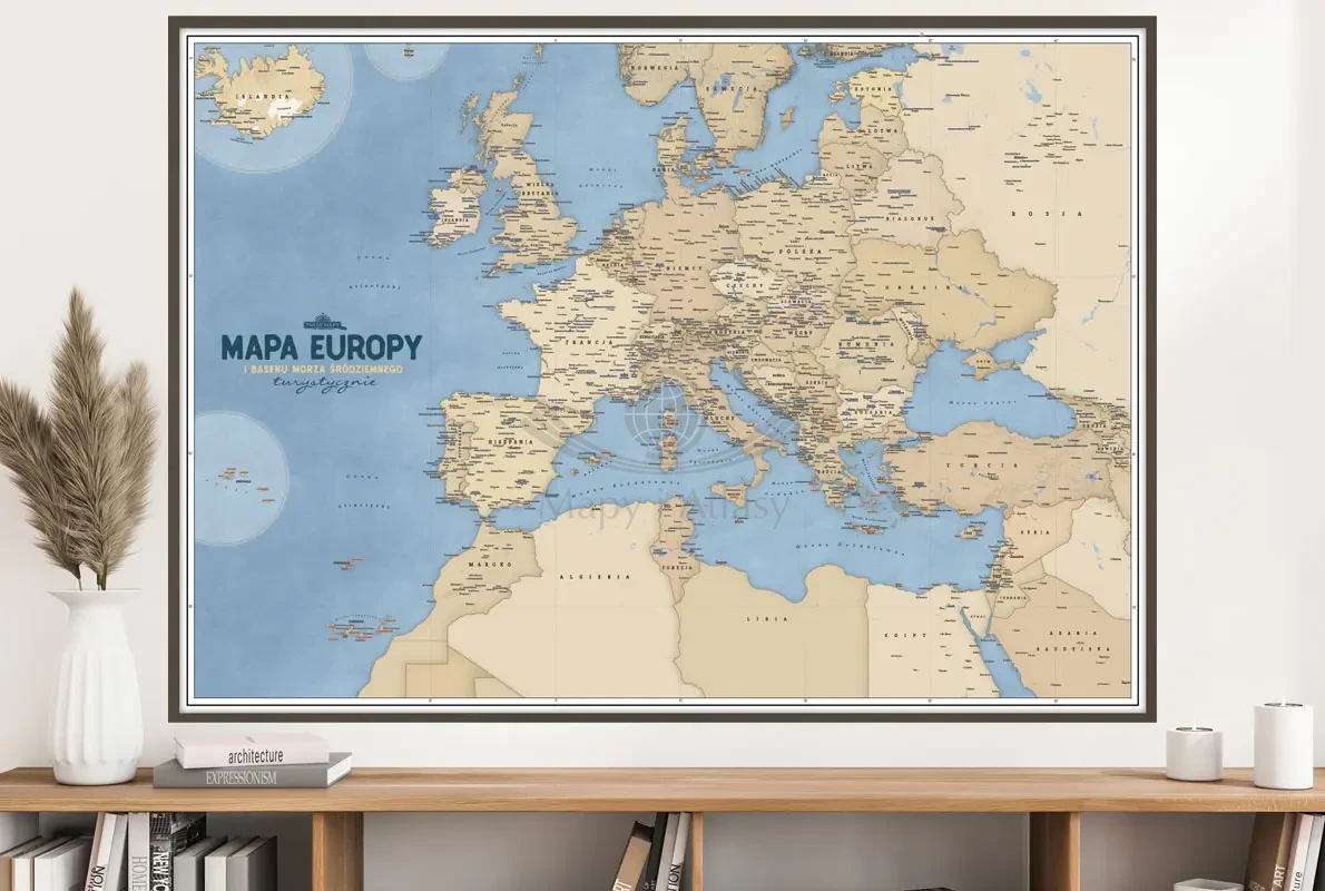 Mapa Europy i basenu Morza Śródziemnego na ścianę, która jednocześnie pokazuje to co mapa fizyczna i polityczna, a dodatkowo kilkaset najciekawszych turystycznie miejsc.