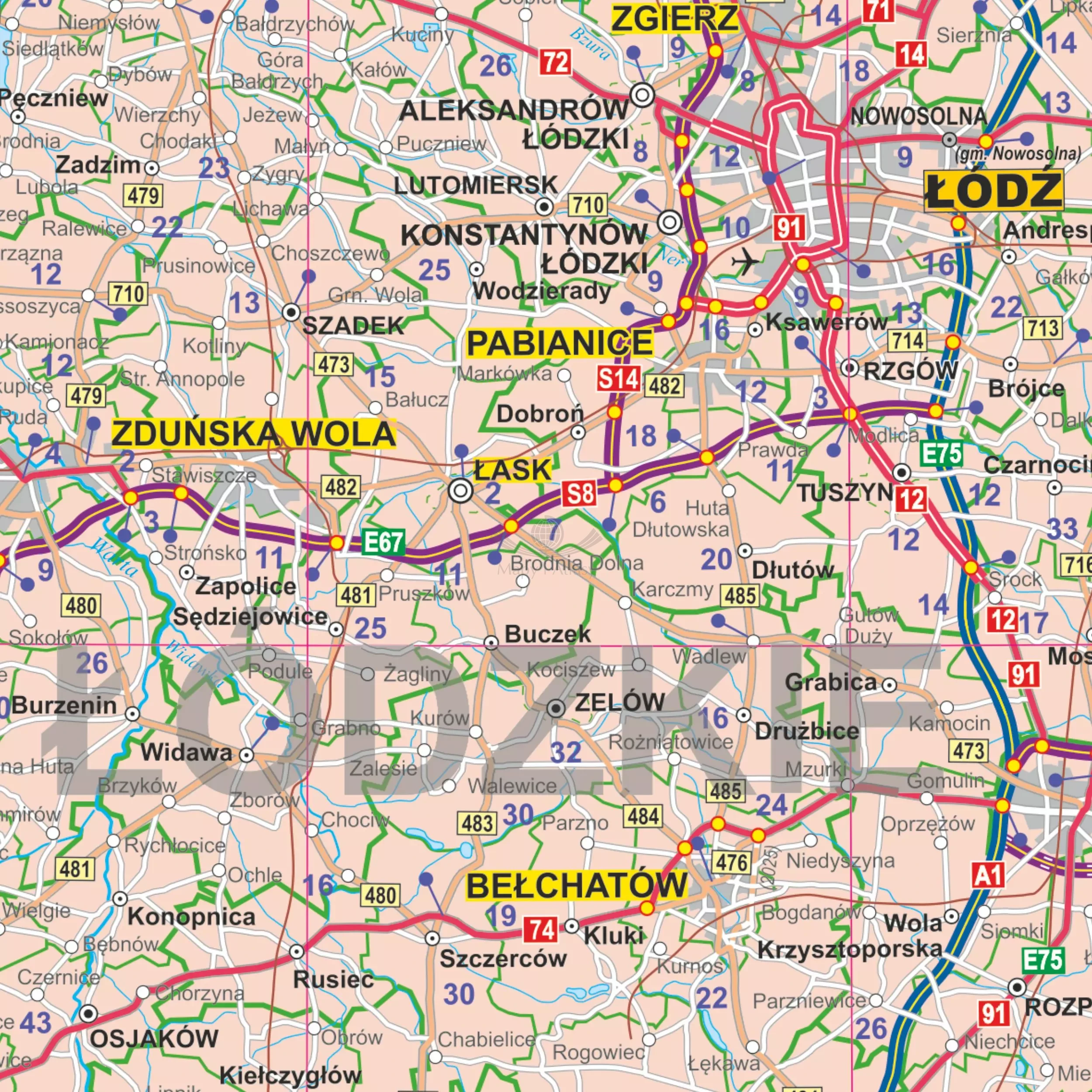 - aktualną sieć dróg i autostrad wraz z numeracją,