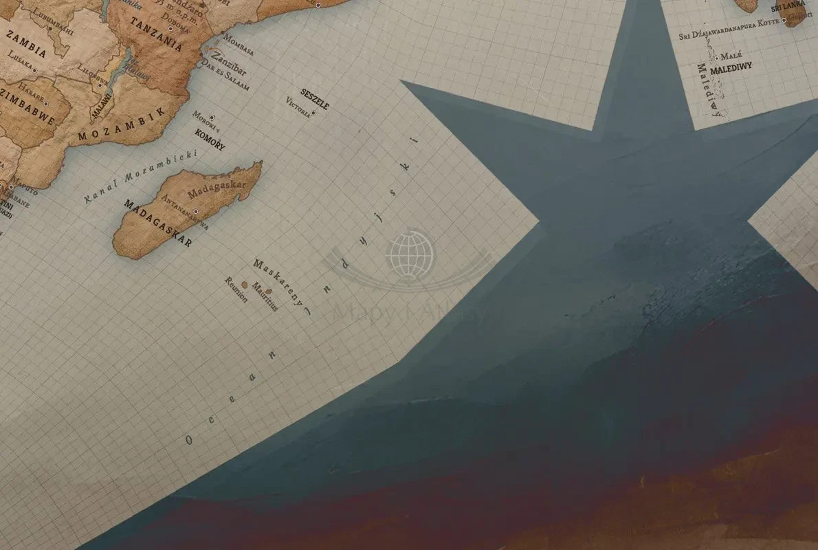 Ramka, którą widzisz na obrazkach jest częścią projektu mapy i jest na wydruku. Jest wydrukowana, ale zaprojektowana tak, żeby symulować prawdziwą. Dzięki temu, wystarczy przykleić mapę do ściany (najlepiej przy pomocy Tesa Powerstrip Poster – wtedy nie zniszczymy farby zdejmując lub poprawiając mapę) i już jest gotowa atrakcyjna i wartościowa ozdoba ściany.